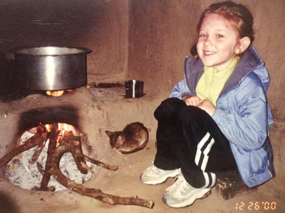 Abbie warming up by the kitchen stove. Ilam tea gardens