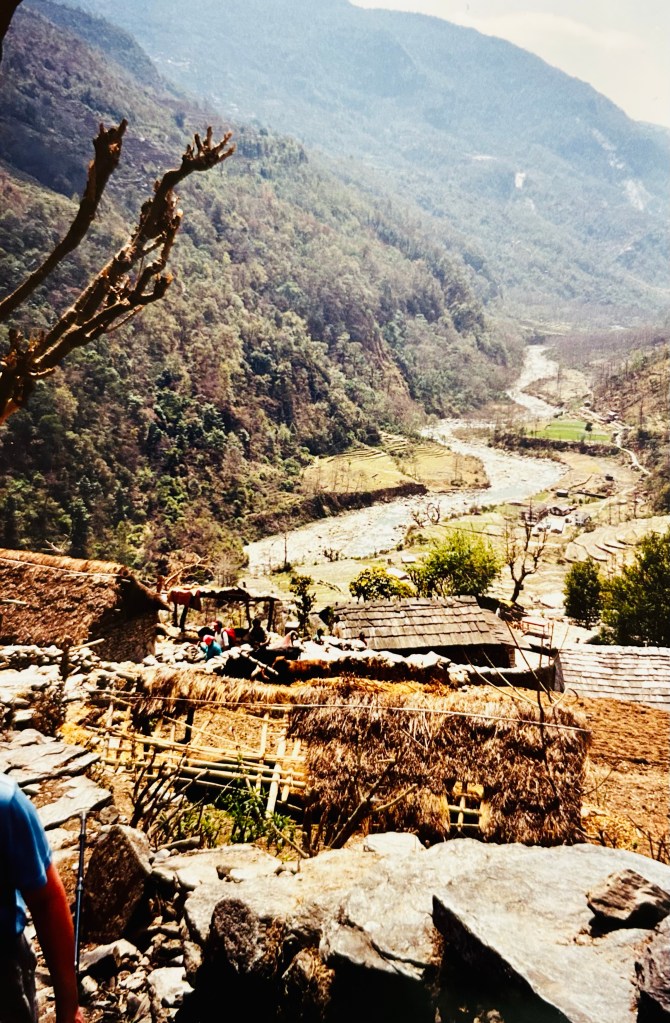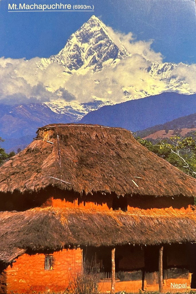 The trek to Shaule Bazar was flat and short, so it was only a couple of hours or so to the tea house where we would sleep that night. Tea houses are common along Nepal’s trekking routes. They are rustic lodgings constructed usually of rough, weathered boards with rooms containing beds made also of rough planks and a thin cotton-stuffed mattress. They also have a primitive kitchen with clay cooking stoves and tables with chairs or benches to feed their guests and other weary travelers passing by. And for the necessary, just outside in the back would be an outhouse—water and a plastic mug provided, bring your own TP.