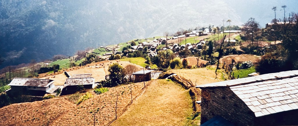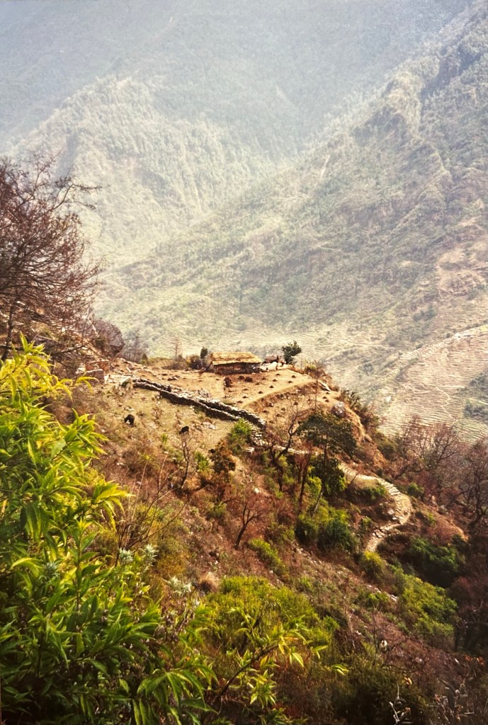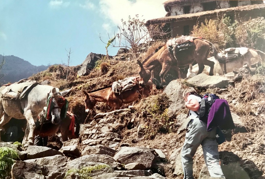 As there are no roads in those mountains all goods are delivered to the villages either on the backs of men or mules. In that region mule trains are very common both going up the trail carrying goods and then coming back down. Nepali mules are very small, American donkey size. So we kept calling them donkeys. And our Nepali friends patiently kept explaining to us that, no, they are mules. When we protested they informed us that a donkey has a cross on its back and Nepali mules are small. And so we succumbed to their wisdom. Our hosts quickly explained to us that when you meet a mule train you must always move to the inside (mountain side) because the mules don’t give an inch and will literally push a person off the ledge.