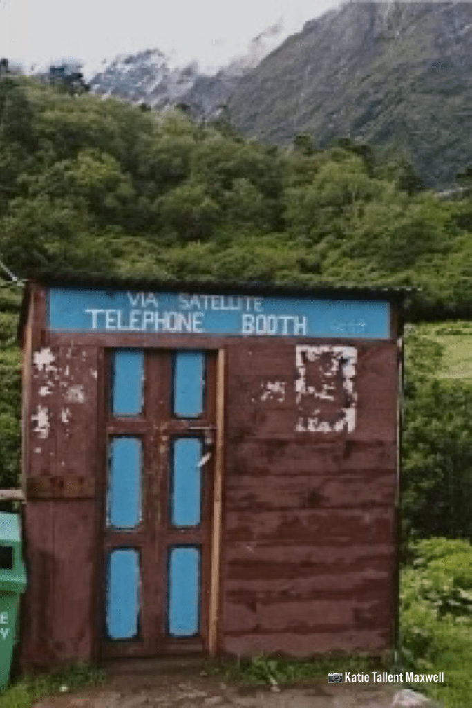 Finally we arrived in Gandruk (Ghandrung) village at 6400 feet (1951 m). Right next to the stair-step trail were chairs and I am pretty sure that I dropped into the very first one! My legs were done. As we sat for a while and drank water we noticed other trekkers that popped up the trail did the same so we didn’t feel quite so wimpy. Conveniently the chairs belonged to Sakura Tea House where we would stay the night. Also very conveniently the tea house kitchen had outside service with the most breathtaking views one could imagine. And, they served pasta. The restaurant owners were a very tall British man and his tiny Nepali wife. They had an actual menu, and the food choices were a welcome variety of cuisines. There was also rudimentary electric service and outside the hotel was quite an unusual sight, a satellite phone booth. On the trail side of the dining patio was a large, black and white goat tied in place with a rope. He was quite friendly and the hotel owners informed me that his name was Michael. Well, my son’s name is Michael and I will chalk it up to the delirium of exhaustion but because of his name I immediately became emotionally attached to Michael the goat and began to greatly miss my son.