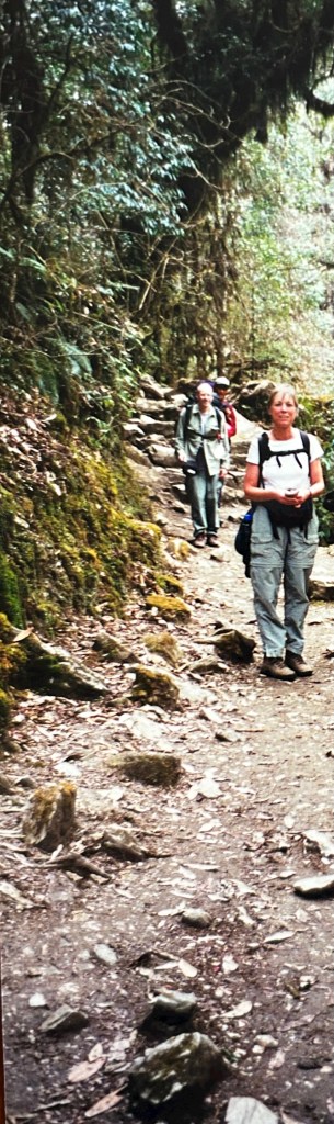 The climb to Tadapani was four absolutely gorgeous miles (6 1/2 km) though a rhododendron forrest. The trees were so thick that very little light came through therefore underbrush was sparse. And the icing on the cake was that the rhododendron flowers were just beginning to bloom adding such colorful beauty to the trail. The lushness of the forrest coupled with the dimness of light created a fairytale sort of atmosphere which brought a joyful, peaceful calm to my soul. It felt a bit like what I described in my blog Once Upon a Time (https://jackietallent.com/2022/06/16/once-upon-a-time/). But in spite of the exhilarating beauty of the woods and the enchanting atmosphere it was still an exhausting trudge. At one point I remember thinking, “If I were at home on a treadmill I would just get off and sit on the couch, but that is not an option here, I have to keep on walking.” So I endured on, one foot in front of the other.