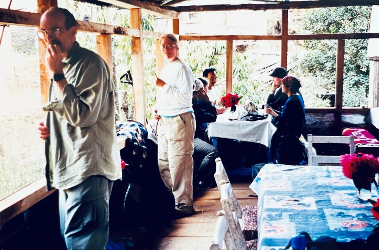 Thursday we walked downhill to Matatati. It was pouring the entire way so we stopped and bought plastics (heavy-duty garbage bags), cut out holes for head and arms, and wore them as rain jackets. It was a nice walk but by the time we arrived at Shamjhana Lodge we were soaked. As I fell asleep it was hard to believe that this would be our last night on the trail.