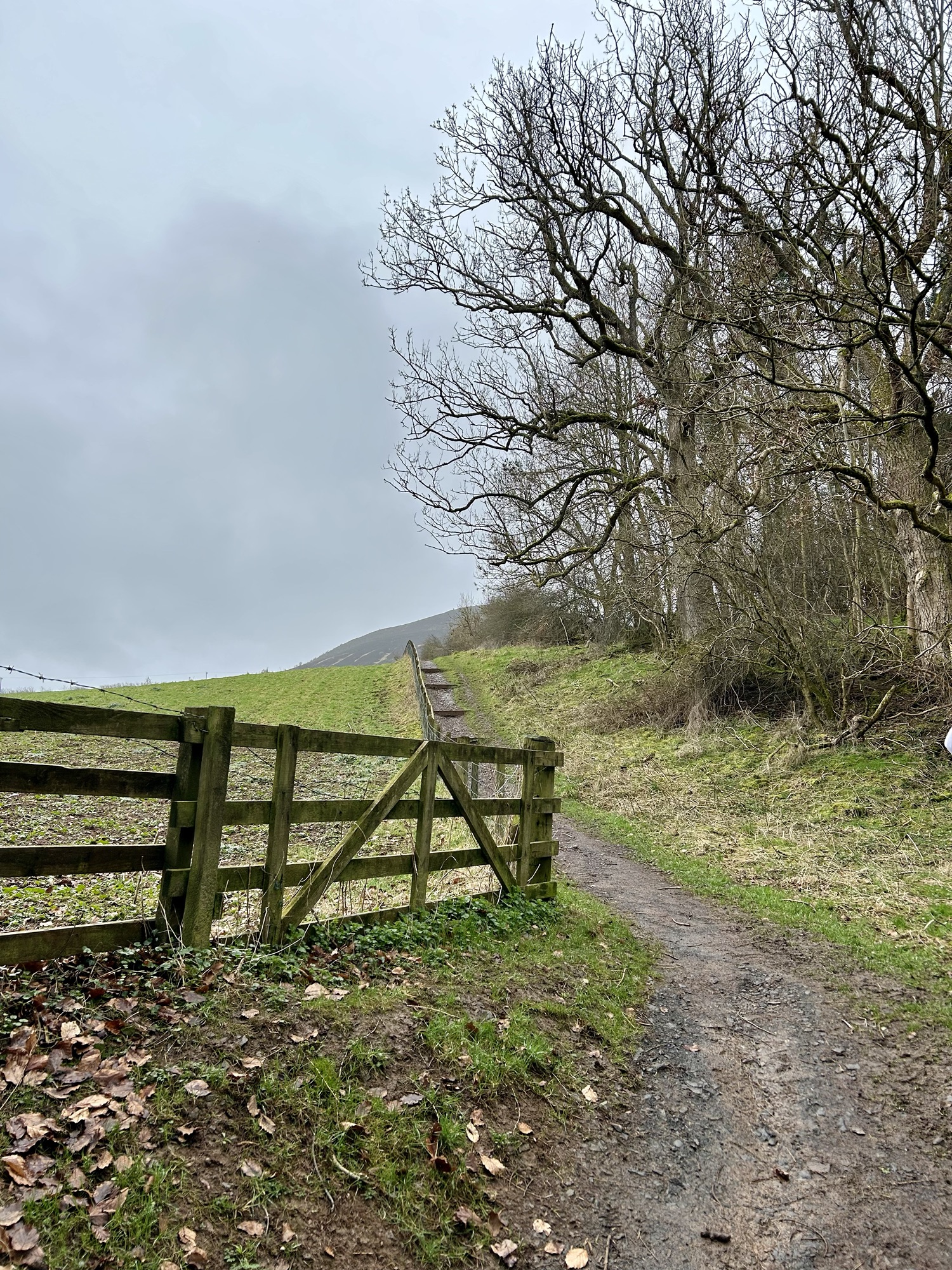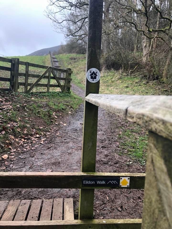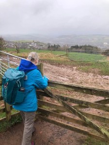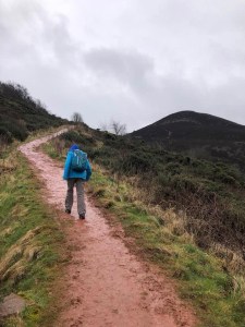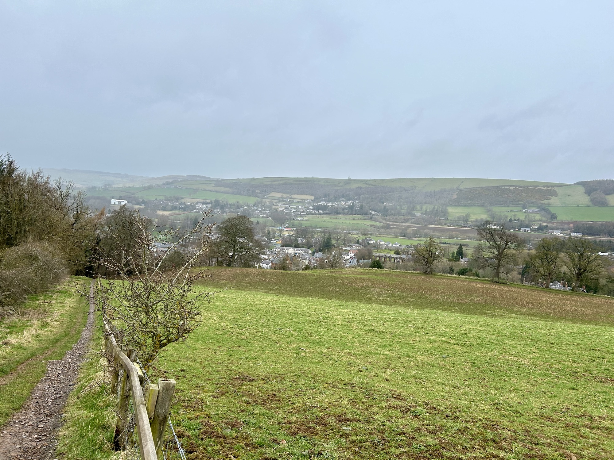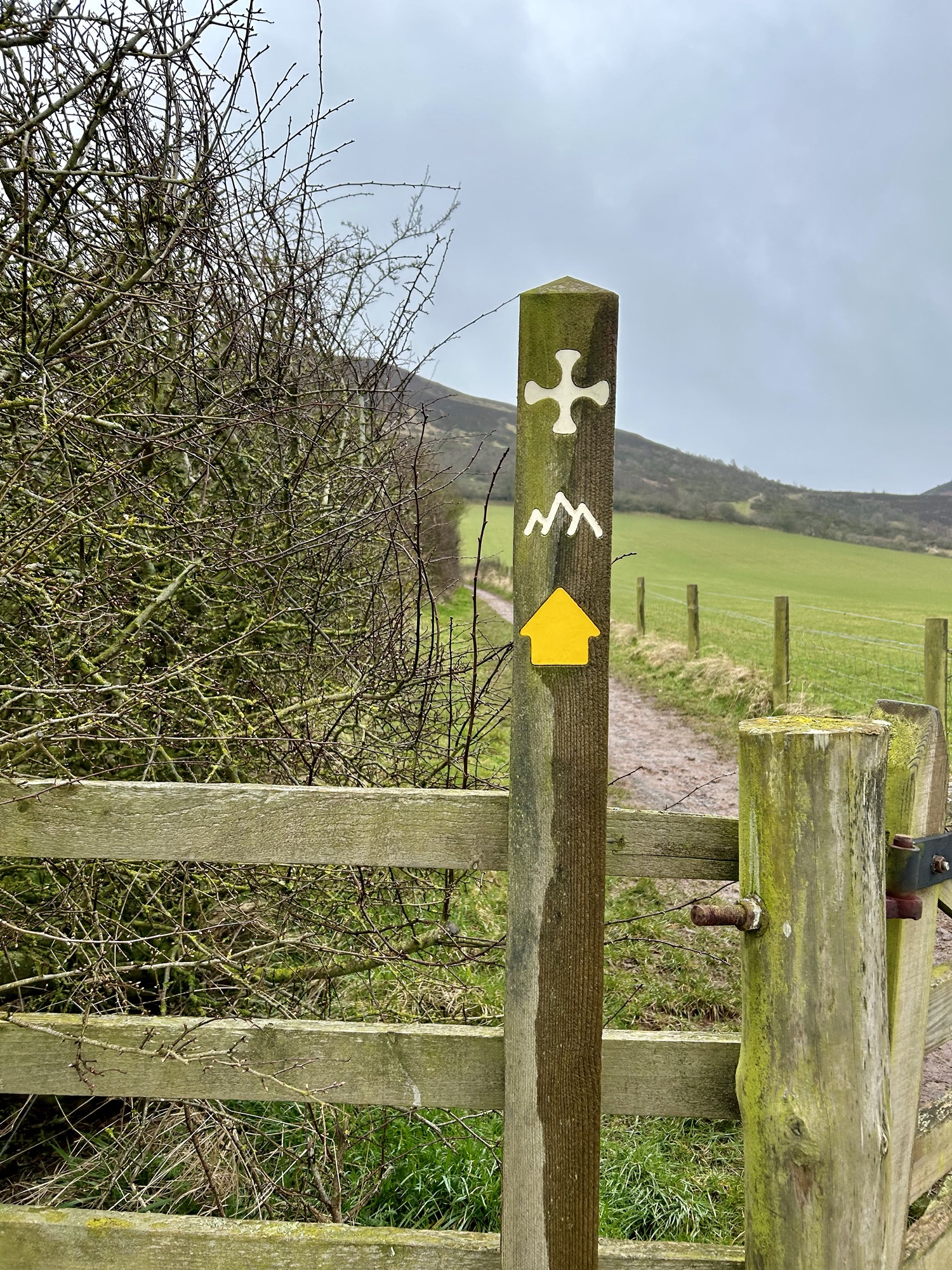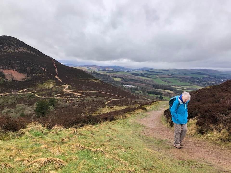 Heading up the street we found a sign marking the trailhead and, voila, we were on pilgrimage! As we stepped off the street we entered an Eden-like wooded space with the whooshing sound of a rushing stream and the joyous songs of a multitude of birds. Walking in amazement at the beauty of it all we soon found planked stairs leading uphill. We had read that for a while there would be benches and that pilgrims should rest on them even if they weren’t yet tired. So we heeded the advice, but it was hard to sit long because we were excited and, having no idea how long our day’s walk would take, didn’t want to be walking unknown paths after dark. Very quickly we were out of the woods and onto the beautiful, sparsely treed, rolling, Scottish hills that one so often sees in photos. The landscape was breathtaking, greener than I had expected since it was still winter, and the villages below became smaller and smaller as we climbed higher and higher. Soon I was wondering why it was already so strenuous; I had trained well enough to handle this. But, we frequently stopped to catch our breath and kept on climbing. We had read that at about the halfway point of today’s walk the path would level out and slowly descend to the town of St. Boswells so there was no trepidation at all.