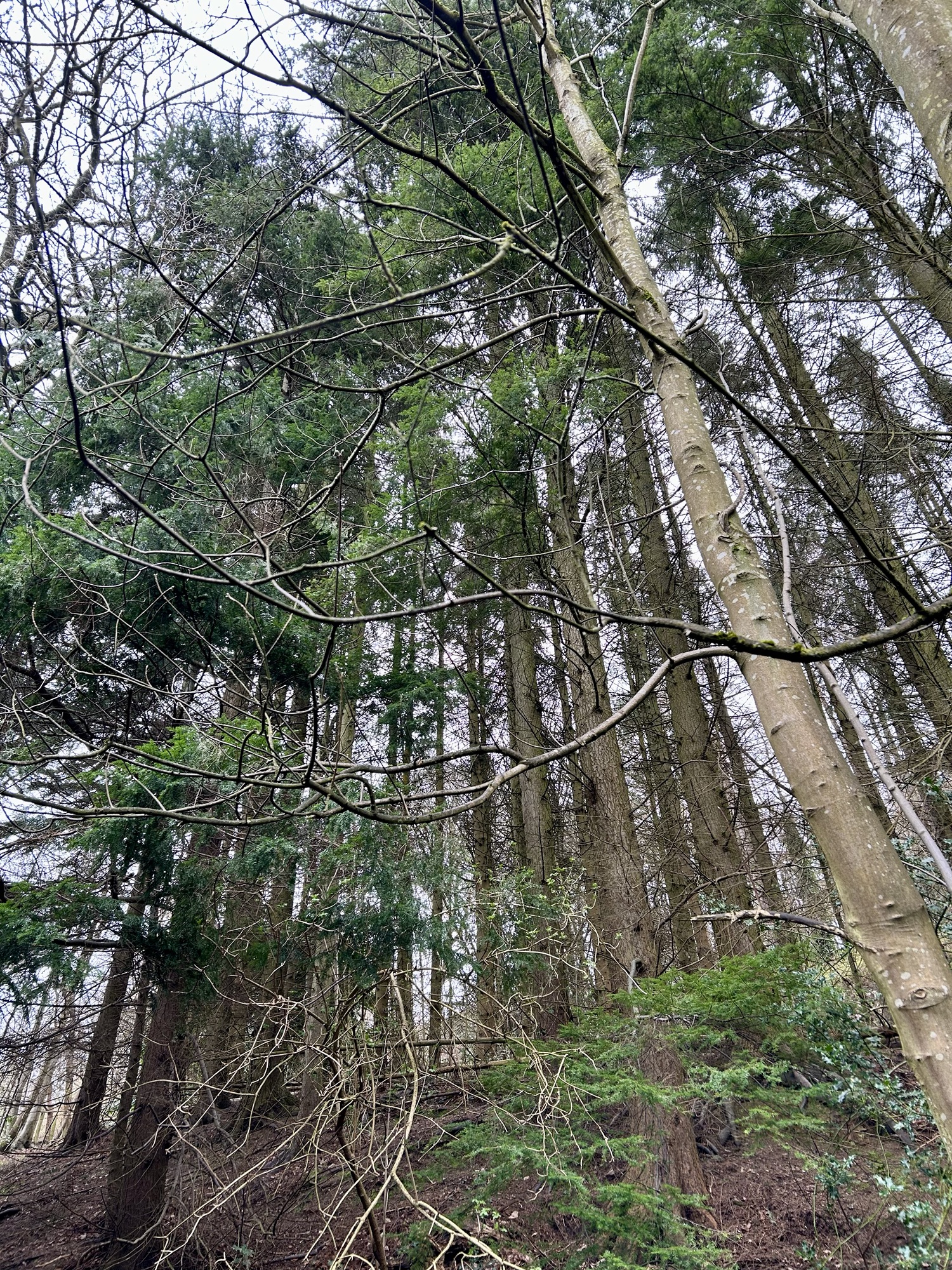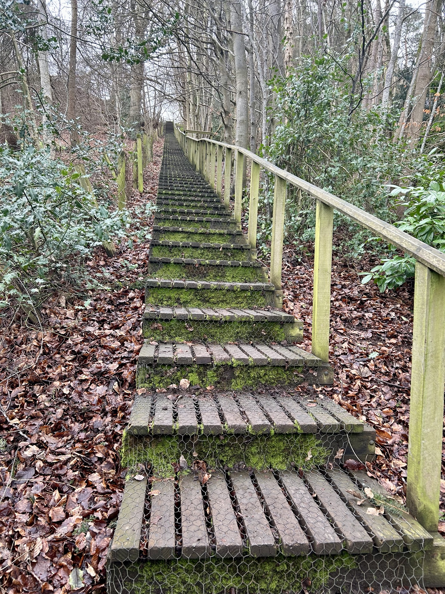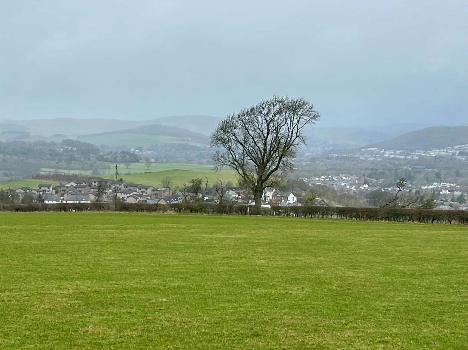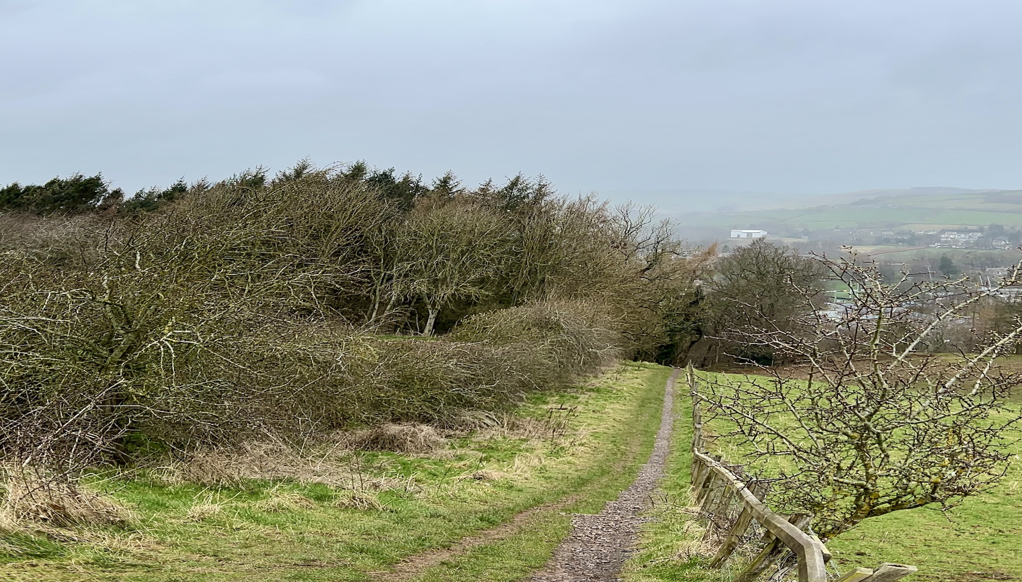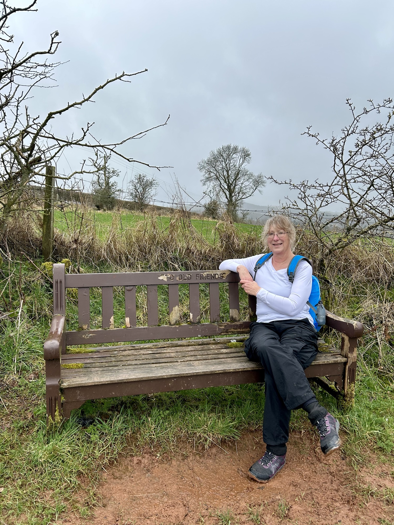 Heading up the street we found a sign marking the trailhead and, voila, we were on pilgrimage! As we stepped off the street we entered an Eden-like wooded space with the whooshing sound of a rushing stream and the joyous songs of a multitude of birds. Walking in amazement at the beauty of it all we soon found planked stairs leading uphill. We had read that for a while there would be benches and that pilgrims should rest on them even if they weren’t yet tired. So we heeded the advice, but it was hard to sit long because we were excited and, having no idea how long our day’s walk would take, didn’t want to be walking unknown paths after dark. Very quickly we were out of the woods and onto the beautiful, sparsely treed, rolling, Scottish hills that one so often sees in photos. The landscape was breathtaking, greener than I had expected since it was still winter, and the villages below became smaller and smaller as we climbed higher and higher. Soon I was wondering why it was already so strenuous; I had trained well enough to handle this. But, we frequently stopped to catch our breath and kept on climbing. We had read that at about the halfway point of today’s walk the path would level out and slowly descend to the town of St. Boswells so there was no trepidation at all.