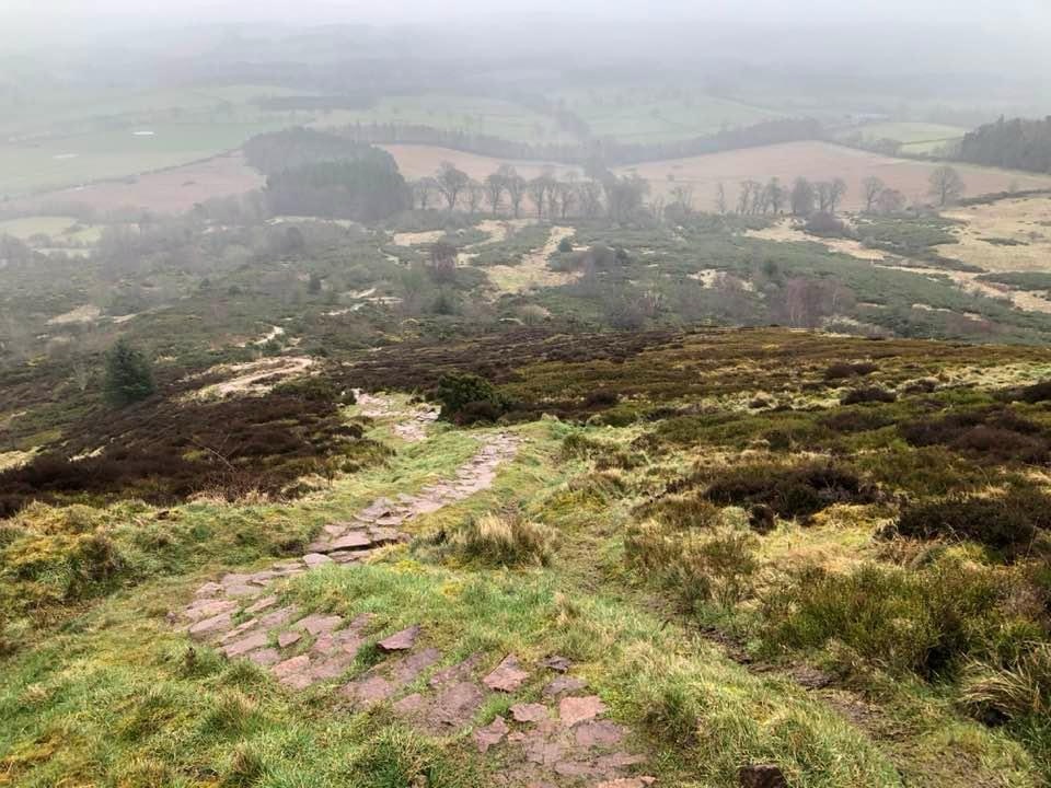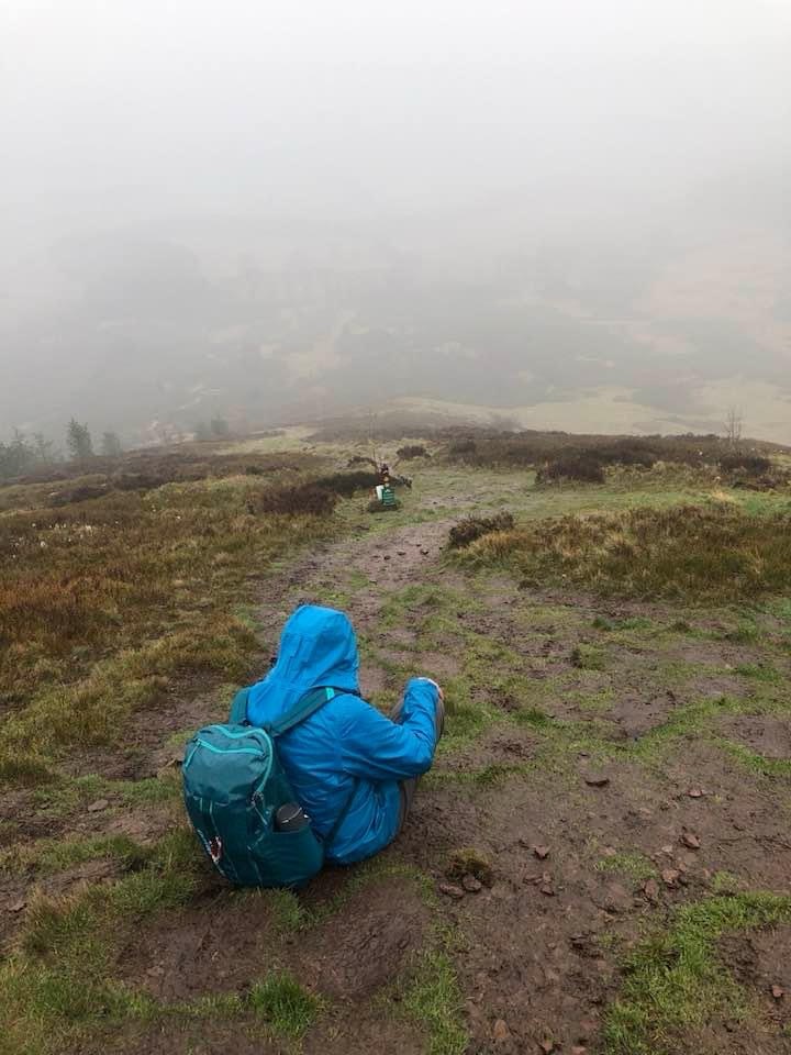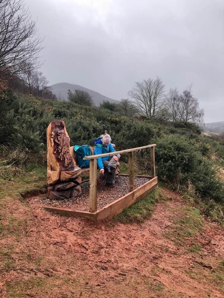 As we ascended the path became more muddy. I had started the day in my barefoot runners but after they slogged down in a seemingly bottomless mud pit I sat down at the, thankfully, nearby bench and changed into my boots. As I was changing, a day hiker coming downhill stopped to chat. She informed us that we were close to the highest point of the trail, that just a bit ahead we would go “through the saddle” between two peaks and then be headed down to St. Boswells and our room for the night.