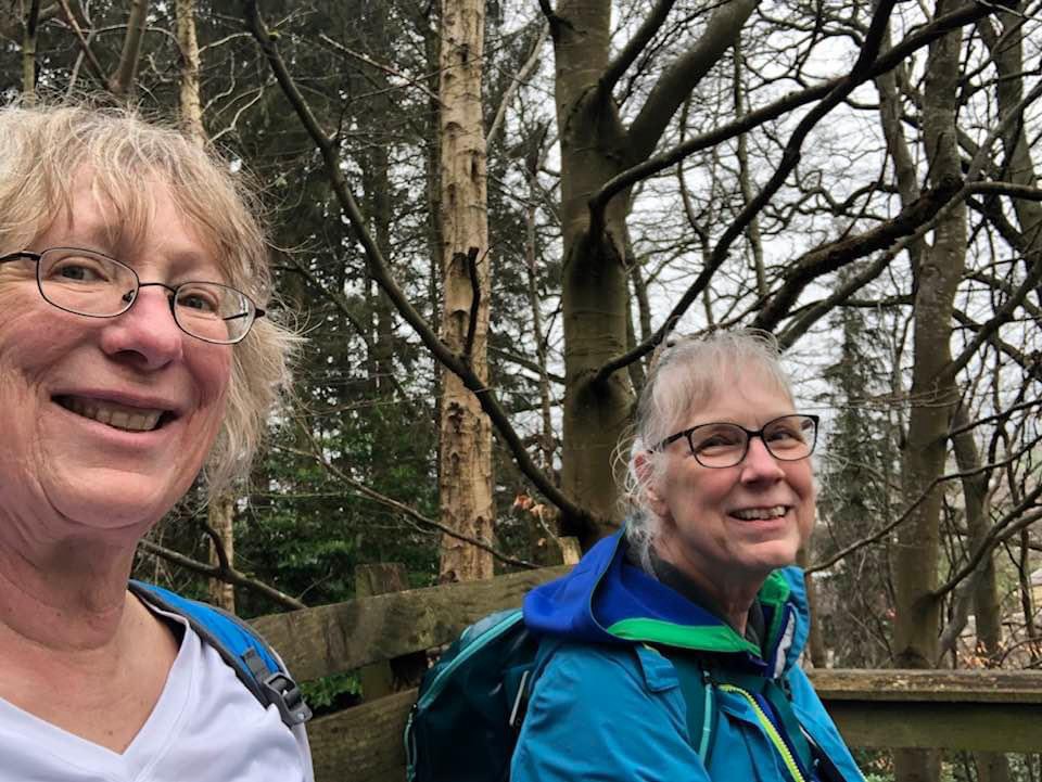 As we started our decent we discussed whether going uphill or downhill is the hardest. I said that for me downhill is definitely easier. That was not to be the case on that hill. The descent was precipitous. And it was extremely slippery. Very quickly my breath prayer became, “Oh, God, help me” and then just “Oh God…” The incline was so steep that with vertigo I did not feel stable enough to walk. Julie tried to hold my arm but that didn’t help. So she let me hang onto her sleeve and that gave me stability enough to ease one tiny footstep in front of another down the hill. Occasionally the trail seemed less steep and I felt capable of walking on my own so I let go. And then invariably fell on my rear. And each time I fell I could not get up on my own; my sister had to pull me up. I could not have made that walk alone and my sister was incredibly patient, encouraging, and positive. Sometimes I thought I saw the trail leveling out ahead. But no. It went on and on and on all the way down to a road at the bottom of the mountain.