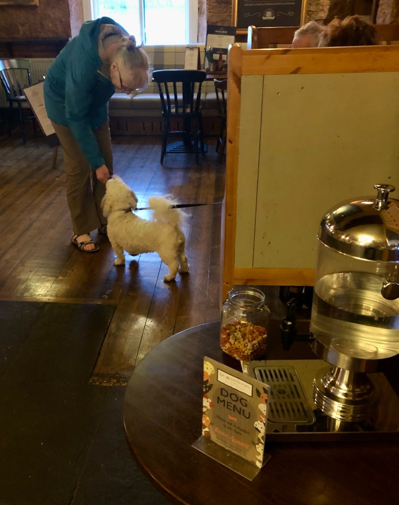 Arriving late Monday morning in Beal with Julie feeling poorly, we declared a rest and recovery day. Of course, we couldn’t get into our room yet but thankfully the dining room was open and so we spent our time there snacking and enjoying the “dogs welcome in restaurants” culture.