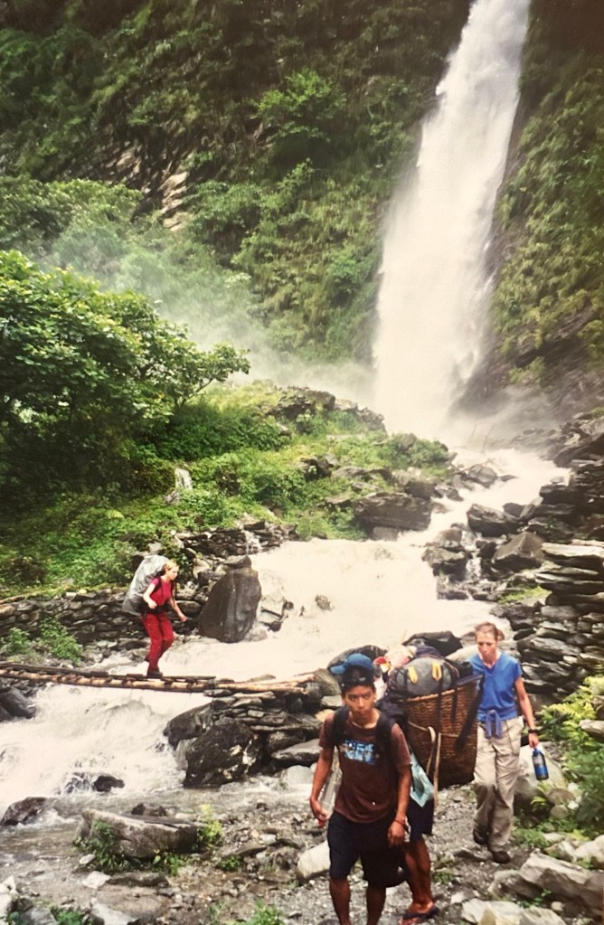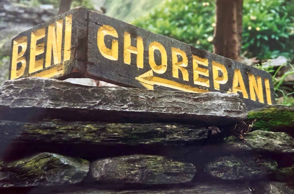 A little farther down the trail, after fording the river again, we stopped at a village (Uleri or Hille?) where a shower was available in an outside “bathhouse” located next to the open air dining area. Several of the tea house workers had birth defects and I silently prayed for them. The sleeping area upstairs was quite small. A door that opened onto a balcony over the dining area was low and several of us received painful lumps on our heads for not stooping low enough to pass through.