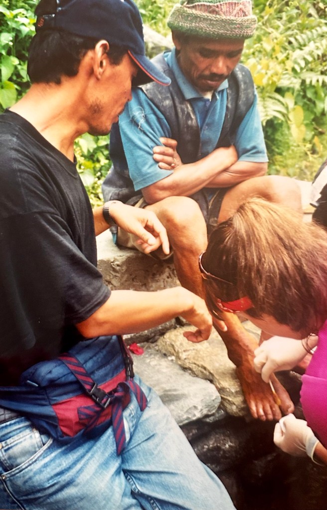 The final day of our trek, July 16, 2001, was eventful. We set out from Lete early morning on the downhill (thankfully!) walk to the highway. Passing through a village west of Ghorepani we were handing out pamphlets to the people we passed along the way when someone stopped us. Their friend had injured his foot working in the rice paddy and it was infected. Could we treat him they asked. As one of the girls cleaned the wound and applied antiseptic gel I was quite concerned because the foot was yellow and I told Deepak that he needed to get to a doctor. Deepak assured me that the color was from working barefoot in the rice paddy, not from the infection.