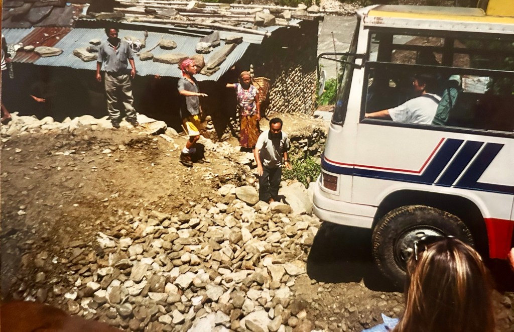 And so, the work began. We were many so while it was hard work it only took an hour or so. Then one by one all the vehicles began crossing the “rock bridge” and soon it was our turn. I vividly remember standing to the side watching the bus rock and sway as if it would tip over as it gradually crossed, and I am pretty sure I did not take a breath until it was completely on the other side. Once across the guys all jumped onto the “bridge” and began tossing rocks to the side. The workmen shouted, “What are you doing?” Robbie informed them that we were removing the rocks just as we had agreed. The men said, “No, please leave them. Perhaps someone else will need to cross before we are done.”