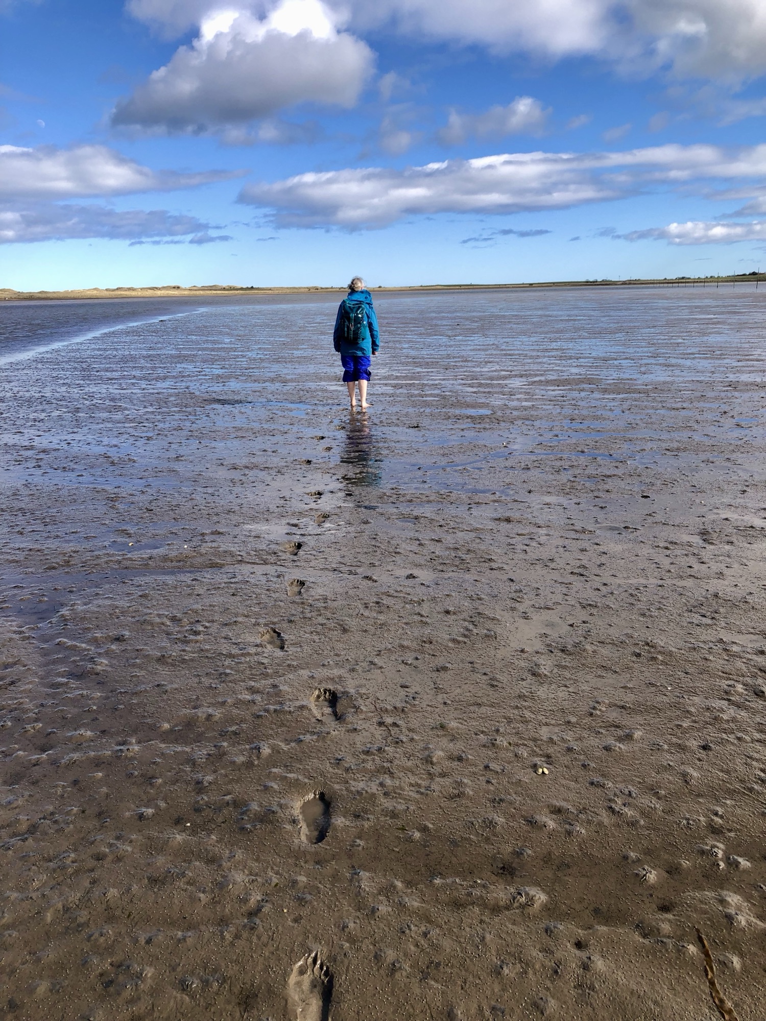 Below are images of the first part of the 3-mile walk. The idea of leaving our footprints in the sand was very significant to us. When we stepped off the causeway onto the beach a professional photographer was working and he graciously agreed to snap some photos of us beginning the walk. Lindisfarne can be seen on the horizon.