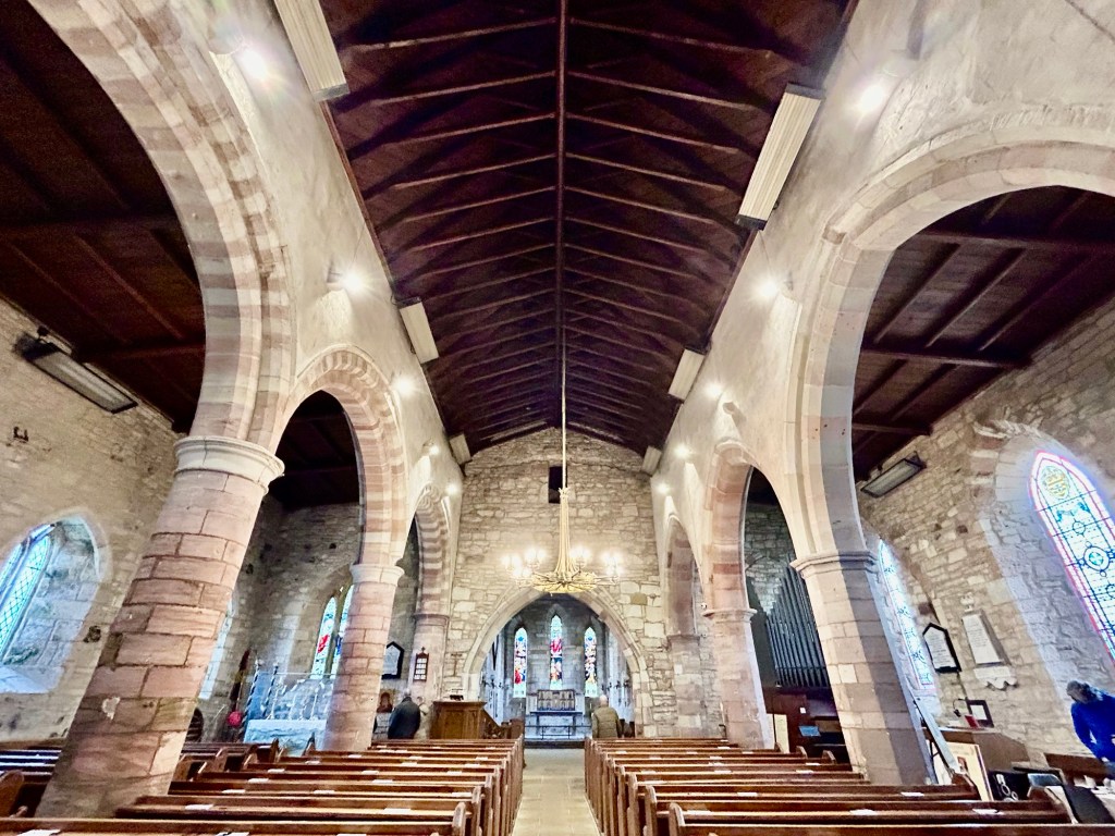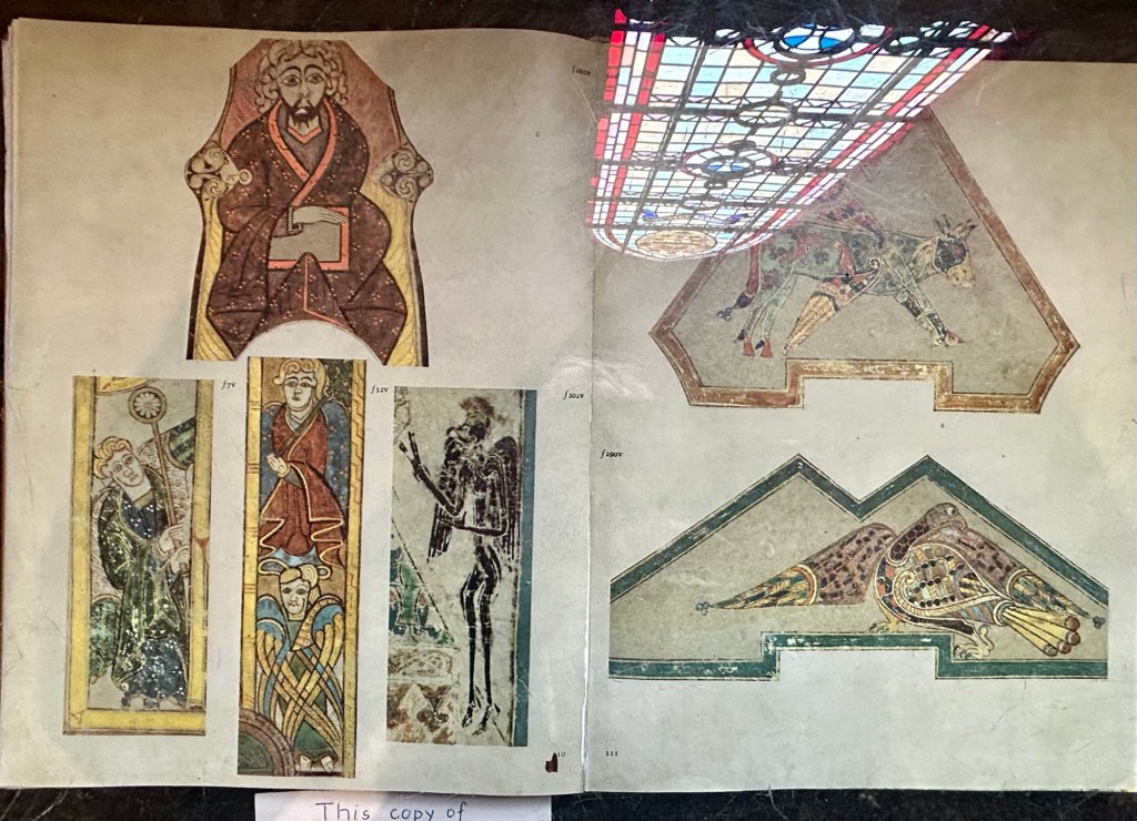 Saint Mary the Virgin Churchwood sculpture of Cuthbert’s body being carriedcopies of pages from the Lindisfarne Gospelsview of the North Sea from the church