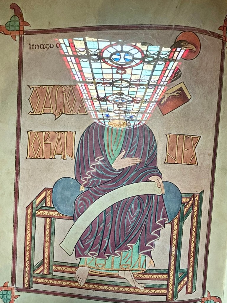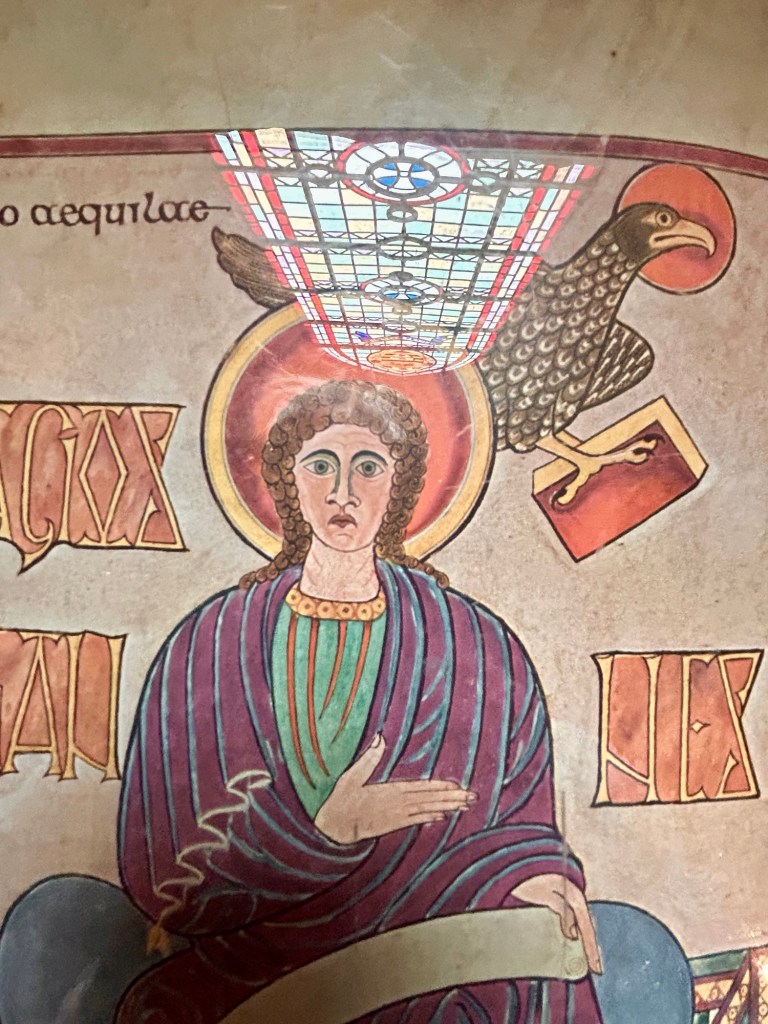 We then walked back across town, made dinner reservations at The Crown and Anchor Hotel Restaurant, and headed to the priory located nearby. The monastery was founded in AD 635 by Irish monks and is situated beside the ruins is St. Mary the Virgin Church. The church is beautiful, full of relics and, ta-da!, the copy of a couple pages of the Lindisfarne Gospels. The original was produced on vellum (calf skins) about AD 720, presumably the work of a monk named Eadfrith who passed away shortly after completing the work. It is currently on display in London at the British Museum.